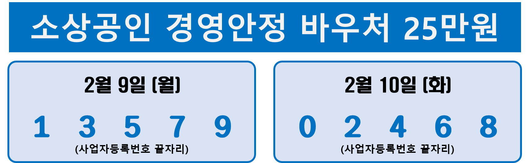 소상공인 경영안정 바우처 신청은 2026년 2월 9일부터 시작됩니다. 원활한 신청을 위해 첫 이틀인 2월 9일과 10일은 사업자등록번호 끝자리 기준으로 홀짝제를 운영합니다. 사업자등록번호 끝자리가 홀수(1, 3, 5, 7, 9)인 경우 2월 9일에, 짝수(2, 4, 6, 8, 0)인 경우 2월 10일에 신청하면 됩니다. 2월 11일부터는 제한 없이 전체 신청이 가능합니다.